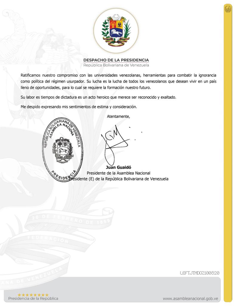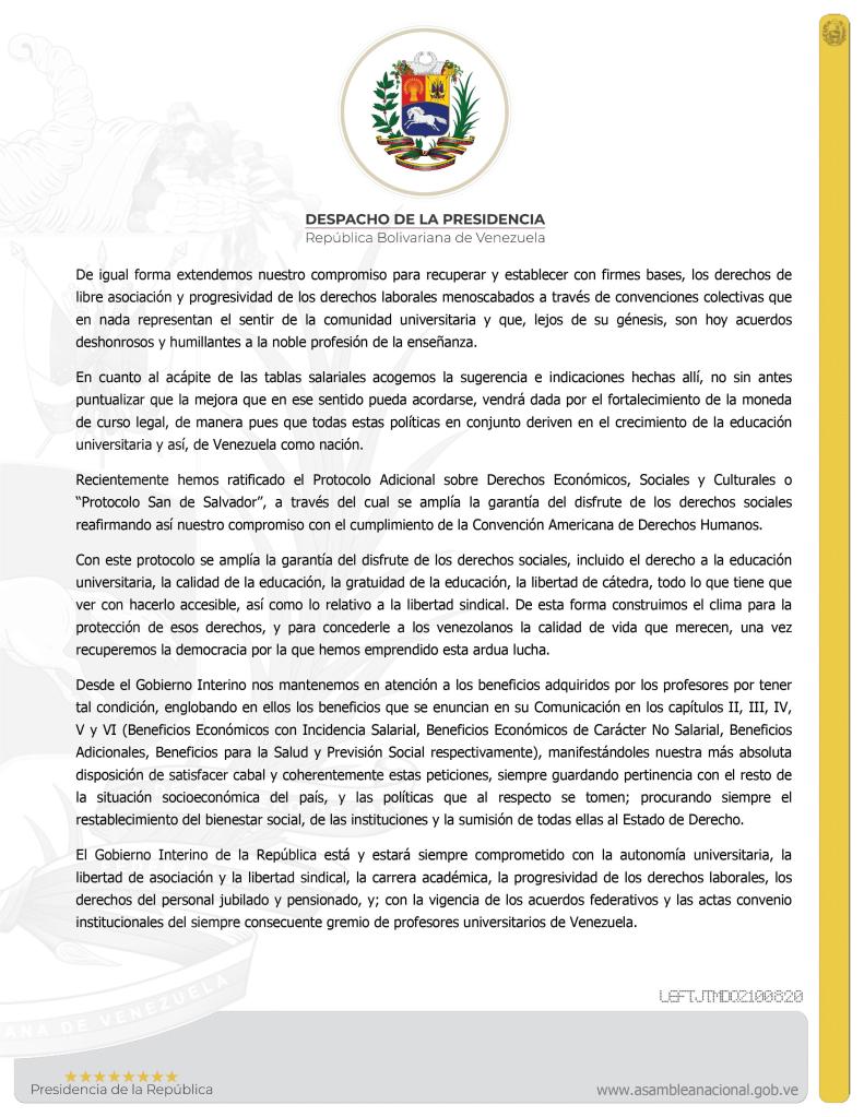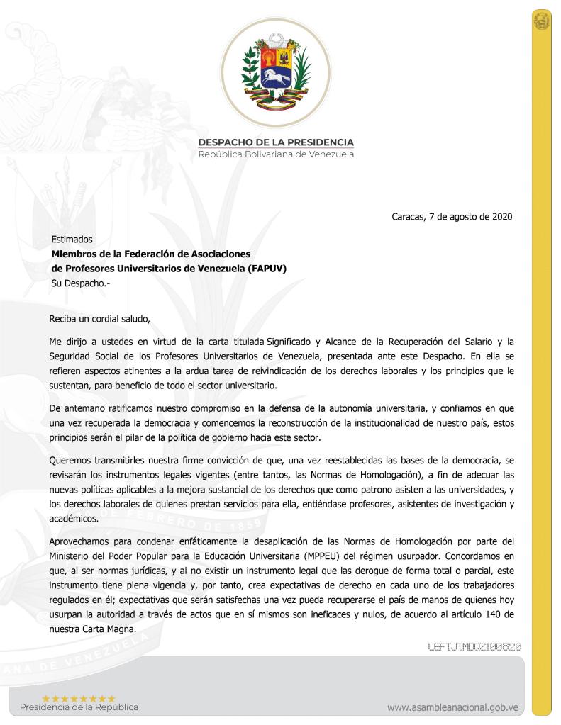Sres. FAPUV Por eso estamos como estamos los profesores universitarios- por sus políticas erradas y torpes que hasta el presente no han conducido a nada- reconocer a una persona como presidente – es simplemente una bofetada a muchos venezolanos que consideramos que una persona como el Sr. Juan Guaido- que apoya una invasión a nuestro país por USA – apoya el robo de CITGO- monomeros – el oro en la banca inglesa- los diferentes activos en varios bancos de USA y Europa- etc- es sinceramente triste su papel por eso el gobierno legitimo de N. Maduro no les presta atención para resolver nuestros problemas.