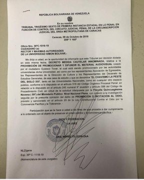 La Federación de Asociaciones de Profesores Universitarios de Venezuela (FAPUV) rechaza el decreto de medida cautelar innominada de prohibición de promocionar y difundir el material audiovisual titulado “El chavismo la peste del siglo XXI”, dictado por el Tribunal Trigésimo Sexto de Primera Instancia Estadal en lo Penal en función de control del Circuito Judicial Penal de la Circunscripción judicial del Área Metropolitana de Caracas de fecha 08-10-2019, a solicitud de la Fiscalía Quincuagésima Novena (59) del Ministerio Público, con ocasión de una investigación seguida a miembros de la comunidad de la Universidad Simón Bolívar, que organizaron un Cine-Foro el día miércoles 9 de octubre sobre dicho documental.