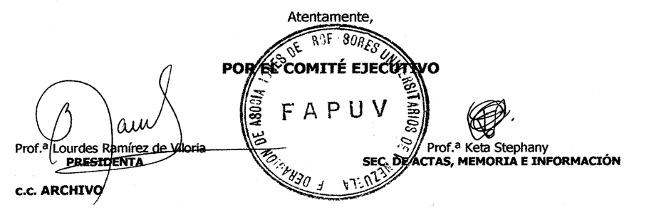 La Federación de Asociaciones de Profesores Universitarios de Venezuela reconoce, felicita y acompaña el esfuerzo de todo el profesorado nacional por una mejor Universidad y por mejores condiciones de trabajo y de remuneración, acordes con la dignidad humana y con la relevancia de nuestra elevada misión, así como por la restitución de la democracia en Venezuela.