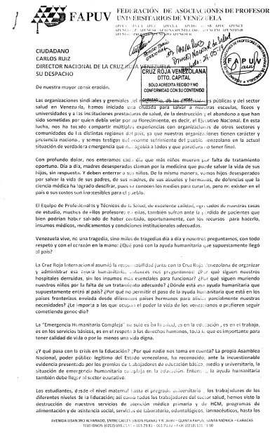FAPUV ha denunciado nacional e internacionalmente esta grave situación que amenaza con destruir todo el subsistema de educación universitaria, debido a que el Estado venezolano se ha desentendido de su obligación de financiarlo y ha desviado los recursos de la educación a destinos desconocidos para la Nación. Los profesores universitarios no son responsables de la crisis a la que esta nefasta política estatal ha llevado a nuestras instituciones.