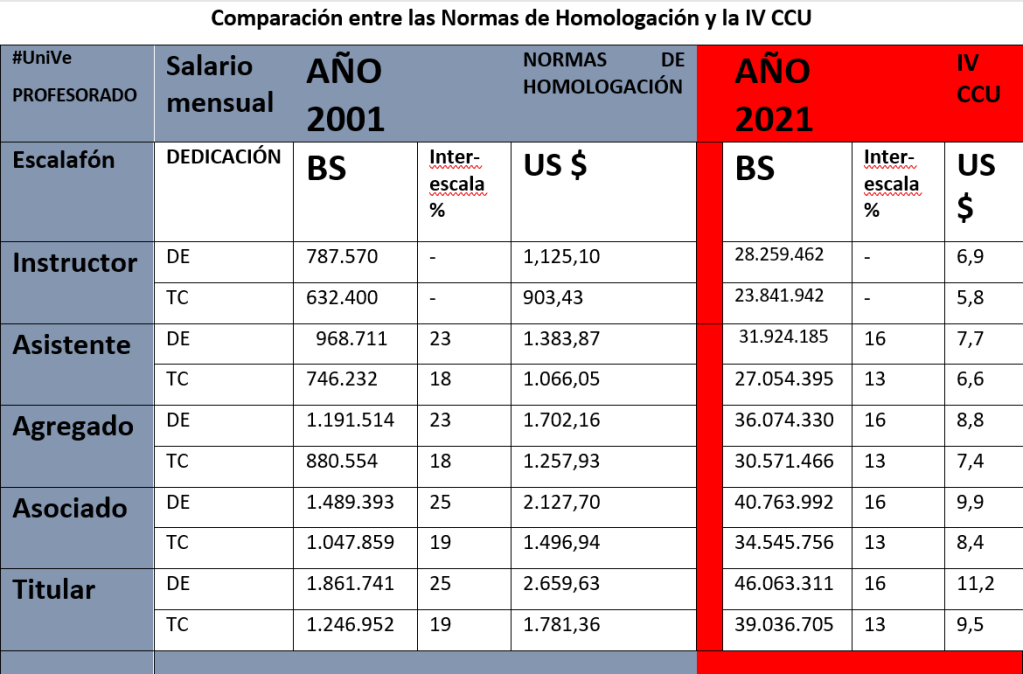En este cuadro se comparan los salarios de la IV CCU negociada en 2021 por la ftuv con el gobierno de Nicolás Maduro, con las NORMAS DE HOMOLOGACIÓN, negociadas por FAPUV con el gobierno de Hugo Chávez en el año 2001. En él, se advierte una interescala que estimula el ascenso y la carrera académica en 2001, vs una interescala disminuida, en perjuicio de la carrera académica, en 2021. Salta a la vista la desaparición del salario como justa contraprestación por el trabajo en la IV CCU. El profesor de mayor escalafón y dedicación pasó de dos mil seiscientos cincuenta y nueve dólares al mes en 2001 a once dólares al mes en 2021: una diferencia abismal. De esos once dólares para abajo es, hoy, la “remuneración” de todos los demás.