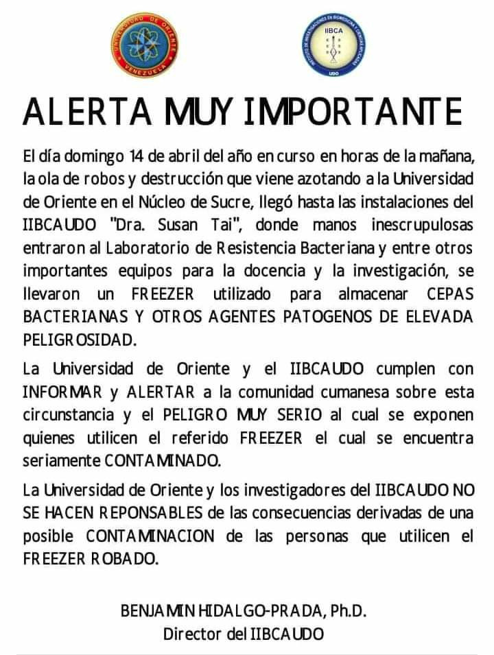 «Desde el día 30 de Abril el Rectorado de la UDO ha sido tomado por grupos irregulares (muchos de ellos ni siquiera estudiantes) que refieren se trata de una lucha por reivindicaciones estudiantiles; sin embargo, en el video dejan claro que sus intenciones en realidad son otras…
